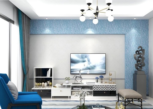 巖紋質(zhì)感的背景墻和湖藍(lán)色的點(diǎn)綴呈現(xiàn)出波光粼粼的山水景象。無論是客廳還是臥室,春之柔軟,躍然而現(xiàn)。